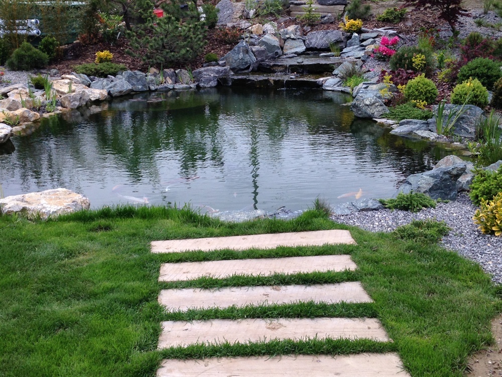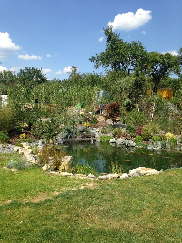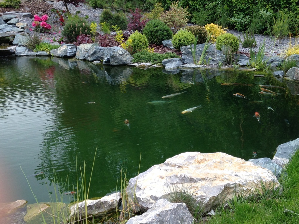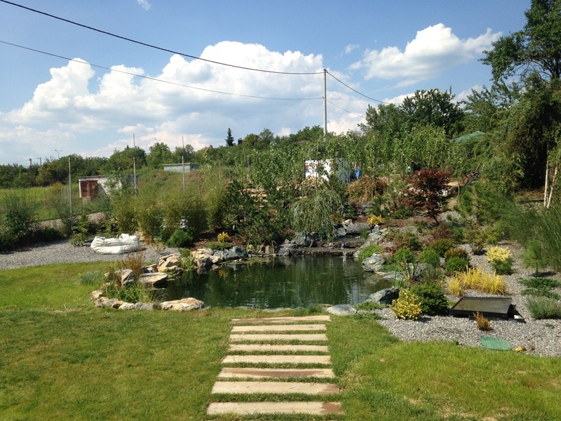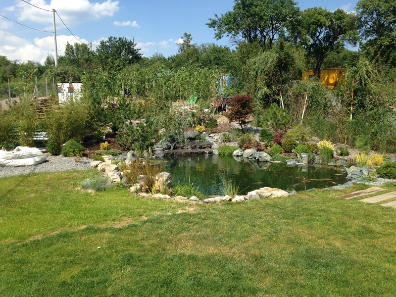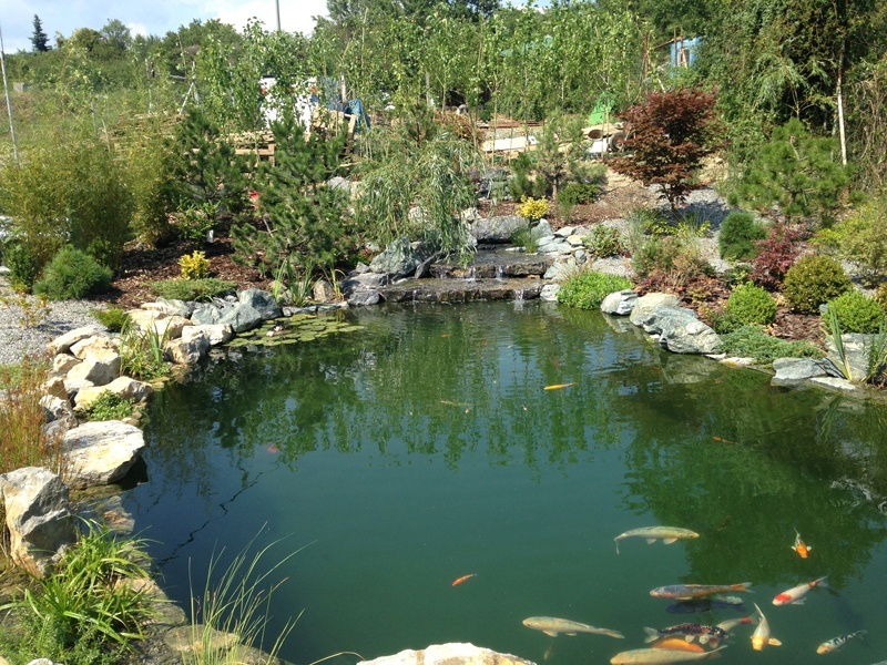 Nádherné Koi jezírko bylo vybudované u naši bývalé prodejny ve Brně - Slatina. Fungovalo jako vzorové jezírko, abychom mohli našim zákazníkům názorně ukázat jak samotné jezírko funguje a jak může být krásné. V zahradním jezírku jsme chovali různé druhy okrasných ryb, všech velikostí. Od japonských Koi kaprů, jejichž délka přesahovala 50 cm, po všechny druhy jeseterů, jímž dominoval více než metr dlouhý jeseter ruský. Díky správně navržené filtraci, dobré navržené cirkulaci vody a správně vyspádovanému dnu, bylo jezírko křišťálově čisté i v těch nejteplejších letních měsících. Celé jezírko je zděné s kolmými zdmi a dno je vylité betonem. Suché zóny kolem jezírka jsme vkusně osázeli vhodnými dřevinami, aby výsledný efekt působil co nejvíce přirozeně. Filtrace byla zapojena přes čerpadlovou šachtu, abychom výtok z filtru mohli využít na kaskádu. Pro zesílení a zefektivnění vodní kaskády jsme do čerpadlové šachty připojili ještě jedno čerpadlo.